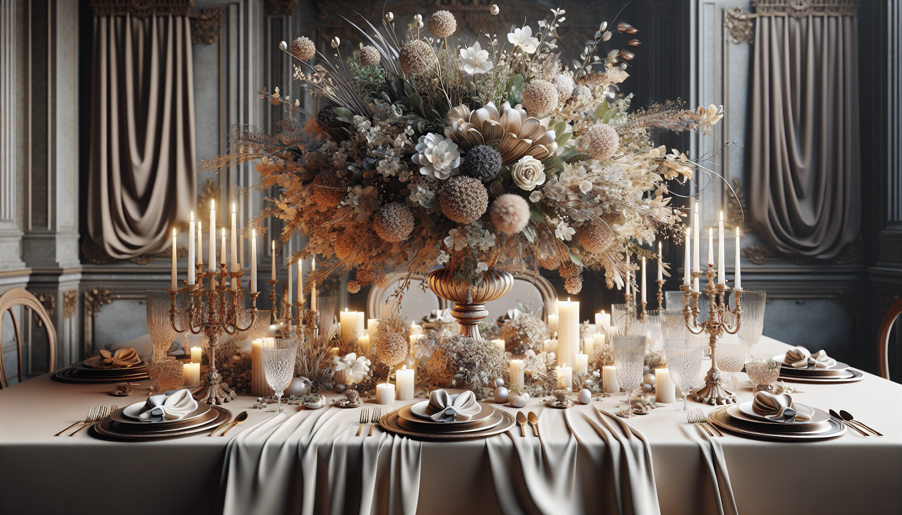 Le centre de table est souvent la pièce maîtresse de la décoration. Qu’il s’agisse d’un bouquet floral, d’une composition végétale ou d’un ensemble de bougies, son placement doit être central sans gêner la vue entre les convives. Par exemple, un centre bas ou fin est préférable pour ne pas entraver la conversation.